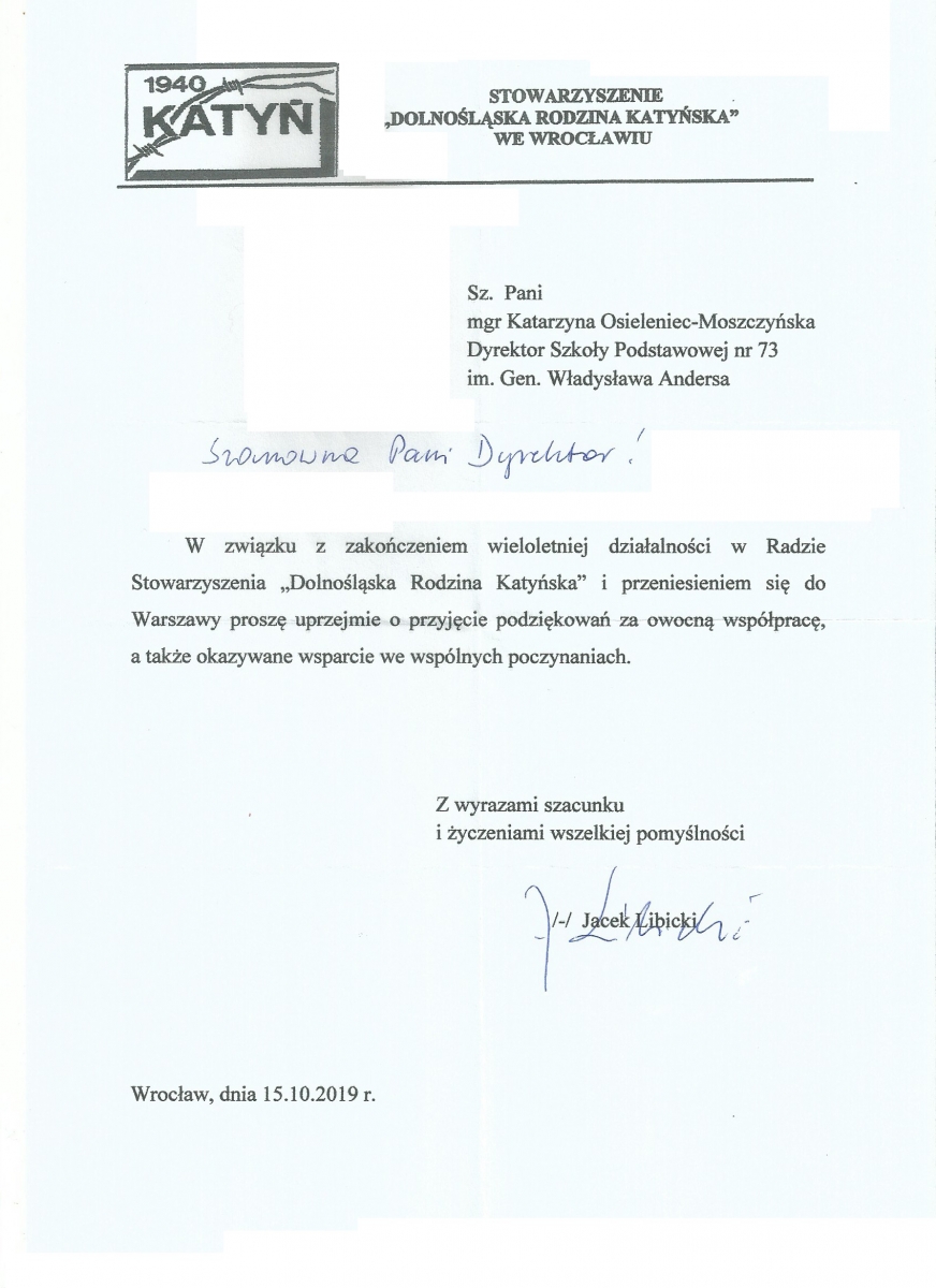 W dniu 17.09.2018 Pani dyrektor K. Osieleniec-Moszczyńska uczestniczyła wraz z pocztem sztandarowym w obchodach Dnia Sybiraka, których organizatorem był Zarząd Oddziału Związku Sybiraków we Wrocławiu we współpracy z Kuratorium Oświaty we Wrocławiu i Stowarzyszeniem Pamięci Zesłańców Sybiru. Uroczystości odbyły się w Sali Koncertowej Polskiego Radia. Podczas uroczystości Prezes Zarządu Oddziału Związku Sybiraków we Wrocławiu Eugeniusz Kuszka wręczył Pani Dyrektor pamiątkowy medale 30-lecia reaktywacji Związku Sybiraków.